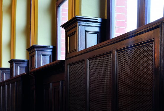 Za szczególnie ważną należy uznać konserwację i renowację zachowanego zabytkowego wystroju głównej sali rozpraw, połączono tu dbałość o substancję zabytkową ze współczesnymi wymaganiami użytkowymi. Pracom konserwatorskim poddano nie tylko najefektowniejszy element wystroju sali – drewniany, intarsjowany strop z dekoracją sztukatorską w formie rozet w otoczeniu rózeg liktorskich, ale także zachowane oryginalne elementy wystroju: stolarkę drzwiową, boazerie na ścianach, piece kaflowe, lampy oraz meble sądowe – ławy i pulpit oskarżyciela, obrońcy i oskarżonego. Na podstawie badań odtworzono dekorację malarską ścian, a oryginalne meble posłużyły za wzór dla uzupełnienia wyposażenia sali o stół i fotele sędziowskie, pulpit dla świadka, ławy dla publiczności, a także ławy na korytarzach sądowych.